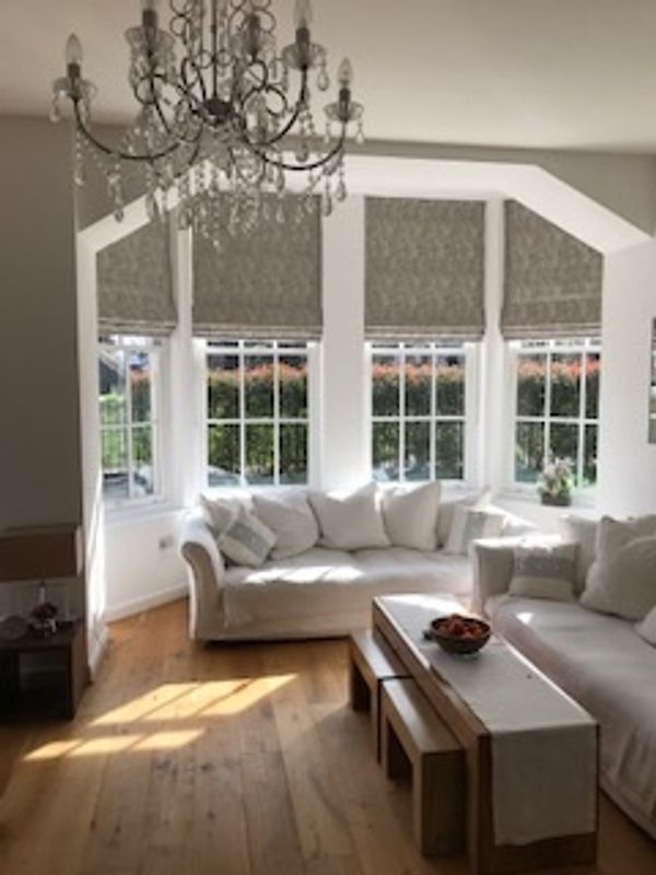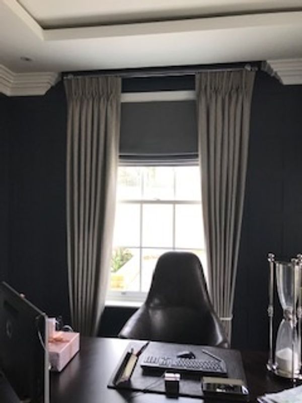 Eyelet curtains with silk Roman blinds.